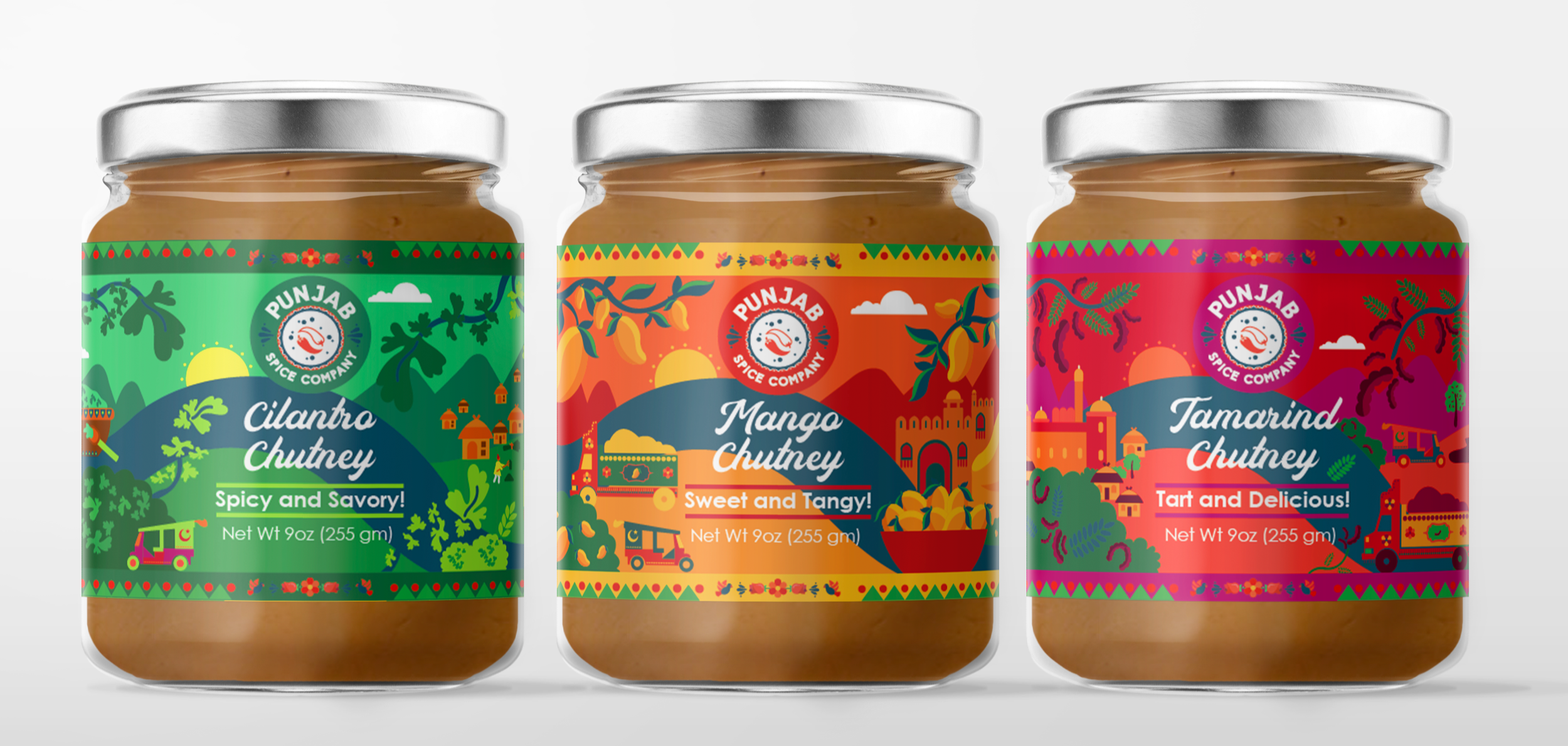 The branding draws inspiration from the farms and vibrant culture of Punjab, Pakistan, reflecting freshness, colour and authenticity. Packaging was designed for three flavours: Mango, Tamarind and Cilantro, giving each a distinctive, appetizing visual identity while maintaining a consistent brand style.
